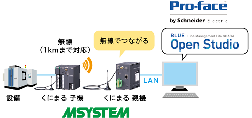 生産・稼働状況の把握や予防保全のためのデータ収集はエムジーのリモートI/Oとくにまるを使用すれば、通信の配線工事が不要です。更にシュナイダーエレクトリックホールディングスのBlue Open Studioを導入すれば自由に画面開発ができ、工場全体の見える化が実現できます。