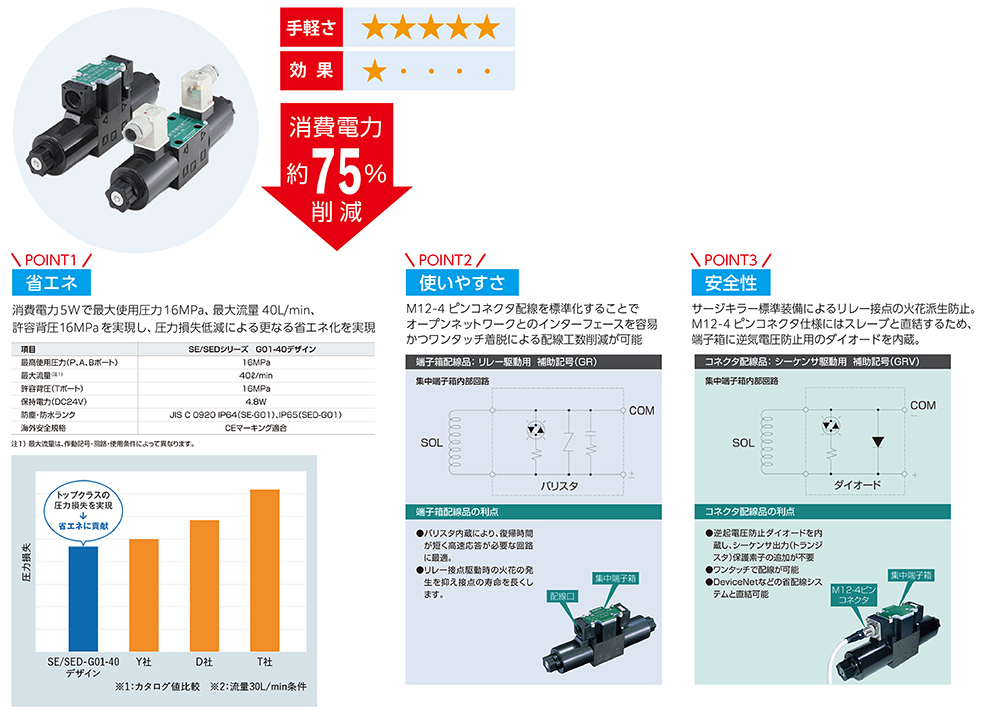 ■端子箱/DINコネクタ配線とM12-4ピンコネクタ配線を 備えた省エネ設計でNACHI史上最高レベルの低電力形ソレノイドバルブを実現