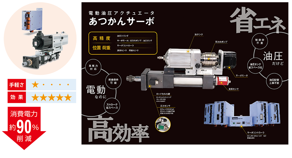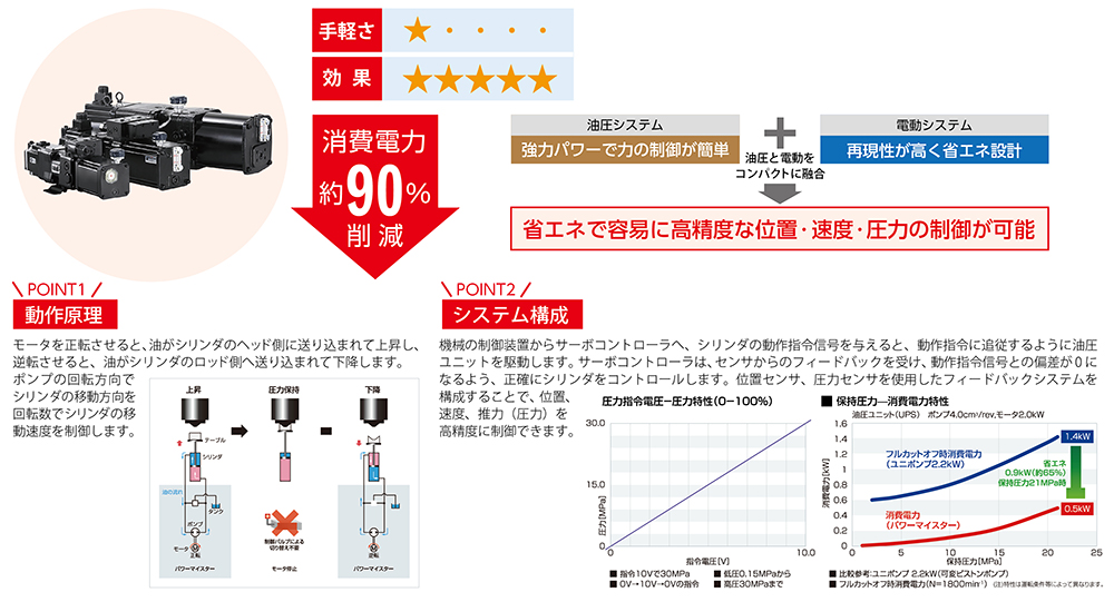AC サーボモータ駆動で負荷に応じてポンプ回転数を制御するので大幅な省エネを実現し、なおかつ高精度な位置決め・推力管理も同時に実現可能です!