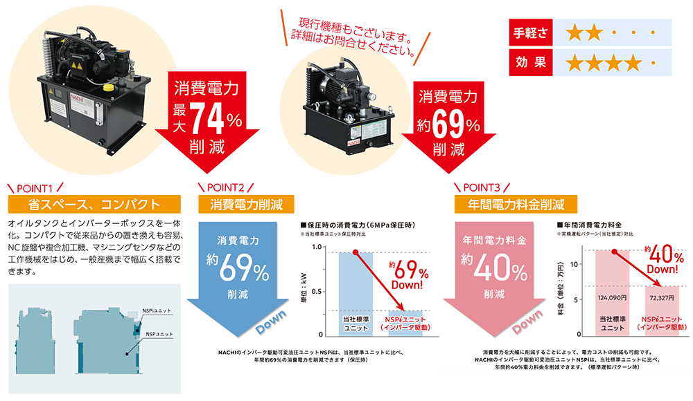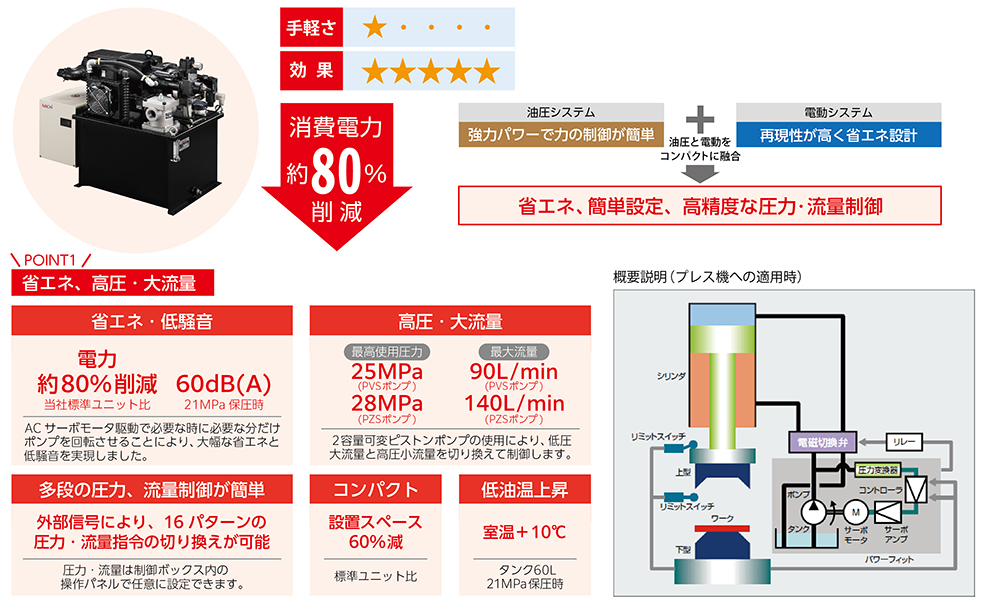 インバータを標準装備した省エネユニットで工作機械のようにワーククランプなどの保圧時間が長いアプリケーションで、消費電力削減に繋がります!