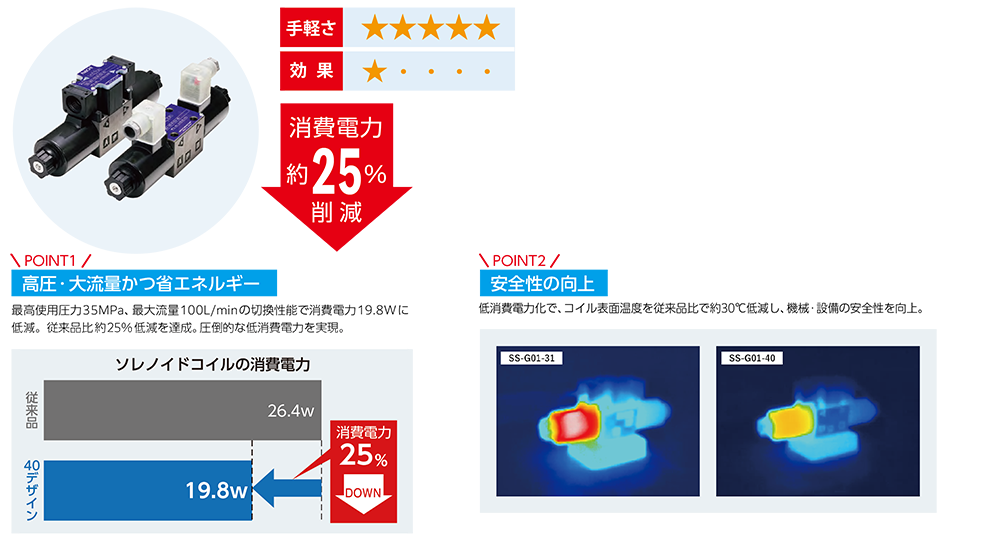 一般的なソレノイドバルブを低電力形ソレノイドバルブに変更するだけで消費電力削減につながります!