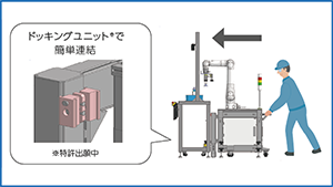 コントローラ、IPC、電源回路等制御機器を全て架台内に格納可能なため追加のスペ ース不要です。また、ハンドル操作のみでキャスタ機能に切り替えできるため移動が簡単。更に、架台のコネクタとドッキングユニットで作業台と架台がスムーズに連結可能なため設置工数を低減します。