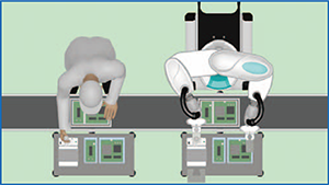 協働ロボットCOBOTTA PROは安全柵なしで設置・稼働可能なため、産業用ロボットのように広いスペース確保が不要で導入が容易です。また、レーザースキャナを活用することで、人が近づいたら協働状態、離れたら高速運転に切り替える事によって、安全性と生産性を両立します。