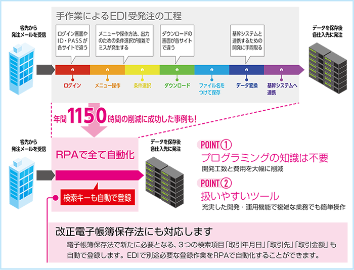 ビジネスの成長に伴って取引が増えれば、業務量も増大します。中でも、業績に直結する「受注業務」は決まった時間内に煩雑な手順で、正確にさばく必要があり、担当者の負荷が高い業務です。「Autoジョブ名人」は受注業務の自動化からスタートしたRPA。特にWebEDIにおいては、RPAシナリオを部品化して提供しており、導入翌日から自動化が可能です。