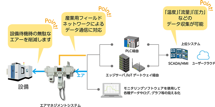 ・生産停止/設備待機時のエア消費を削減 ・各種センサ情報を上位システムと通信可能