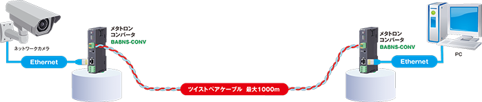 ビルや工場で離れた場所をネットワークカメラで監視する場合、光ケーブルの長距離敷設には大きな費用と時間がかかってしまいます。 メタトロンコンバータなら、1対のツイストペアケーブルで イーサネット信号を伝送するので経済的にシステムを構築できます。