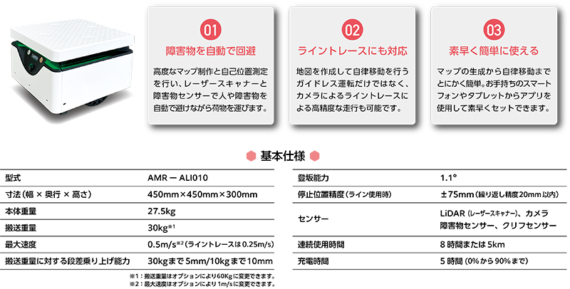 高度なセンサーやマッピングで迅速・安全に移動し、作業時間の短縮と労働負荷の軽減が期待できます!