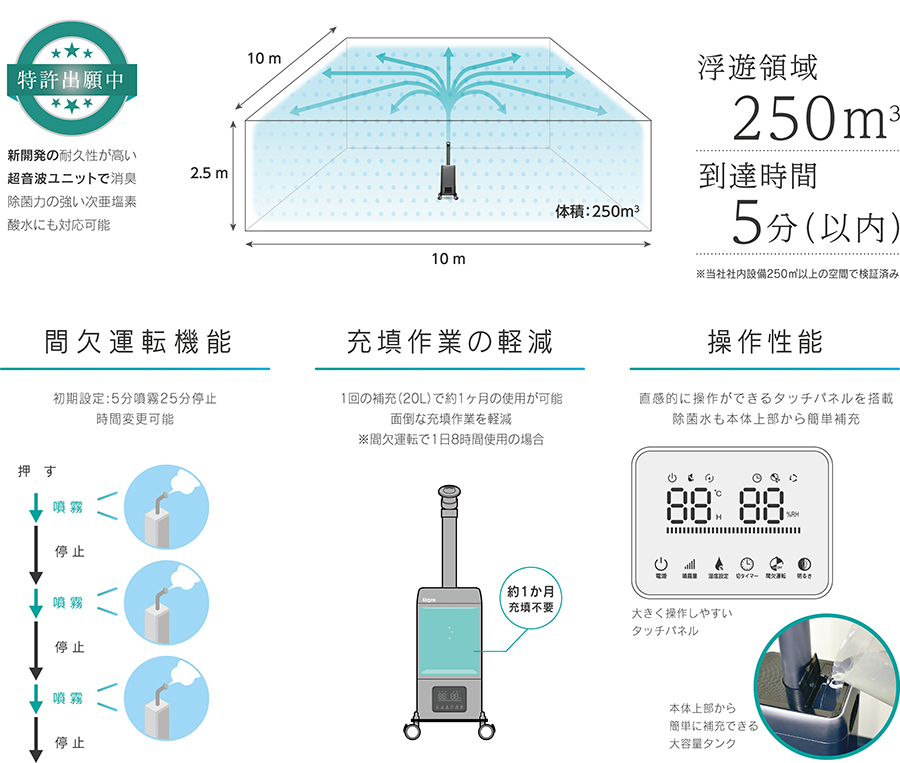 Point❷ ▶︎ 広い空間にも適応する噴霧力 ・・・・・・・・・・・・・・・・・・・・・・・
