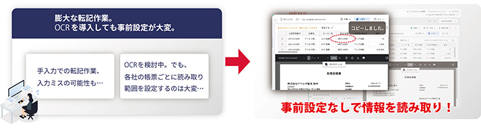 届いた帳票を基幹システムに転記する際、独自開発のAIが必要な情報を自動で判別するので、デザインの異なる帳票でも読取範囲の事前設定なしで読み取り可能です。