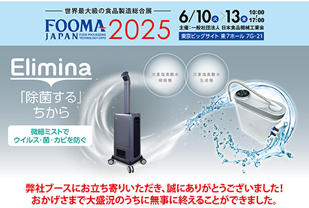 【FOOMA JAPAN】微細ミストで浮遊菌・付着菌を除去する次亜塩素酸水噴霧機 Elimina/空間洗浄Lab.