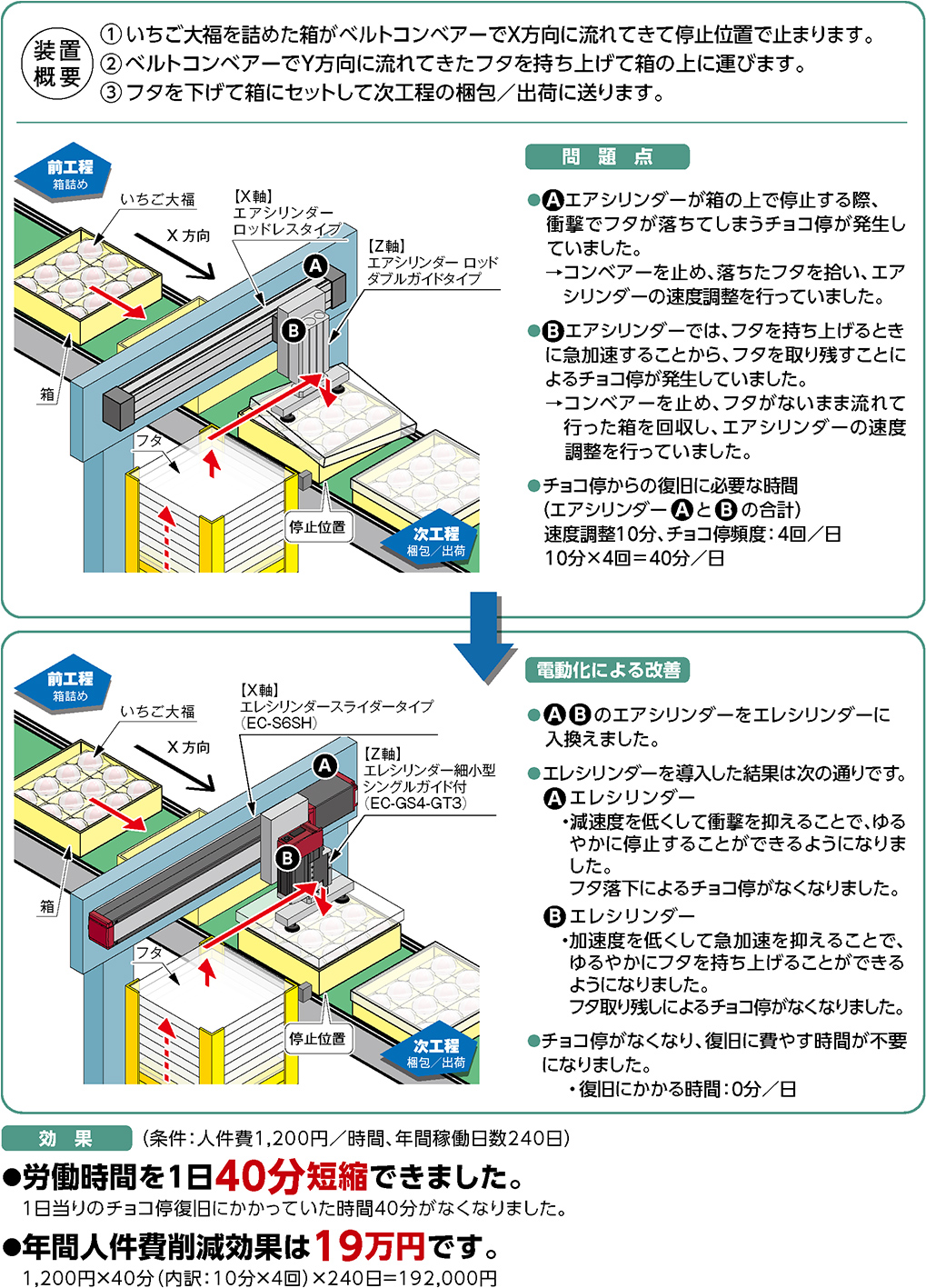 エアシリンダーの電動化で速度・加速度調整を容易に実施 チョコ停が激減【フタ装着装置】 メーカー改善事例集