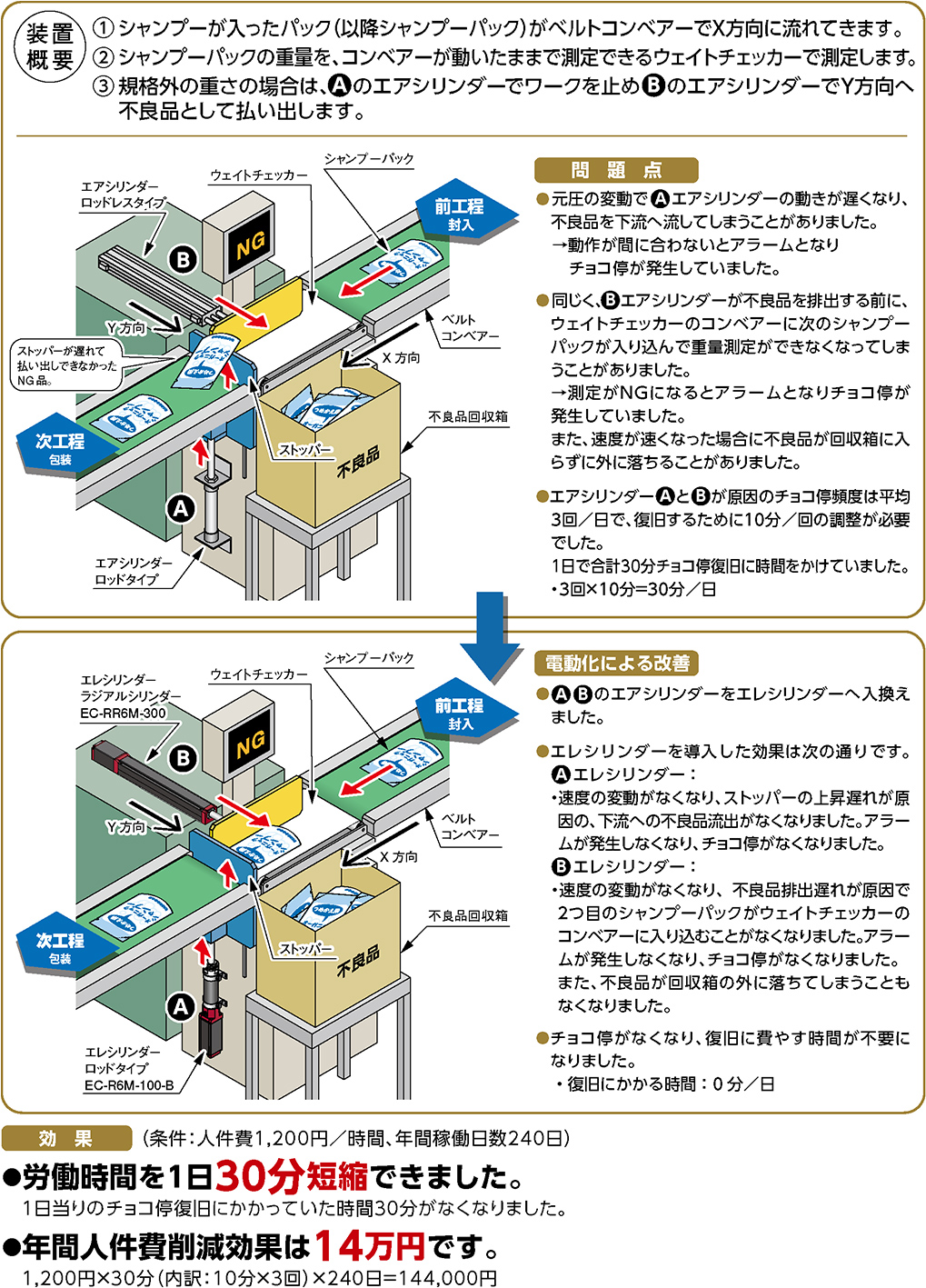 エアシリンダーの元圧力変動による速度変更を電動化で解決【良品選別装置】 メーカー改善事例集