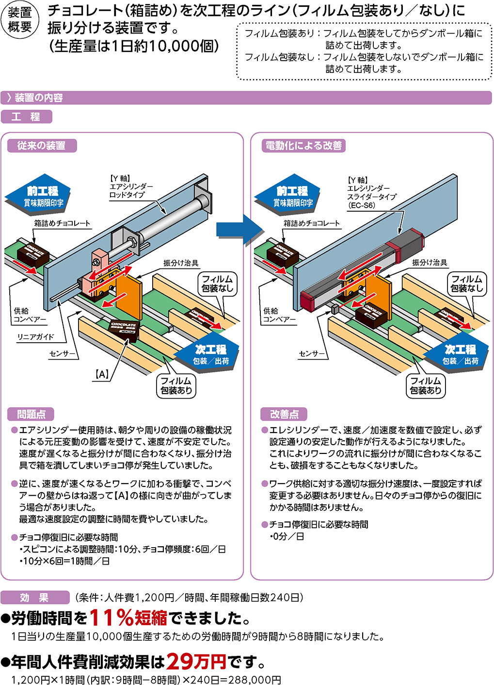 エアシリンダーの元圧力変動による速度変動を電動化で解決【コンベアー振分け装置】 メーカー改善事例集