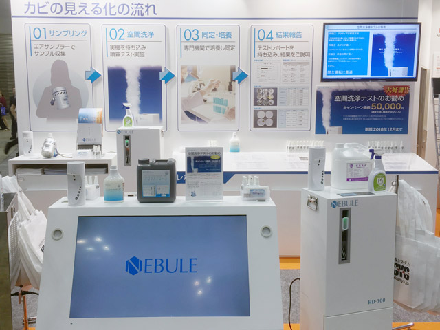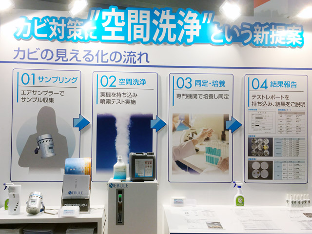 空間洗浄Lab.“NEBULE(ネブル)”の展示では、製品の紹介に加え「空間洗浄テスト」についても紹介いたしました。事前に現場で実機テストを行い、ビフォーアフターの検証ができることを提案しました。来場者からは「“事前の検証”を大きくPRしているブースは他には無かった」と非常に好評をいただき、テストの依頼を多数いただきました。
