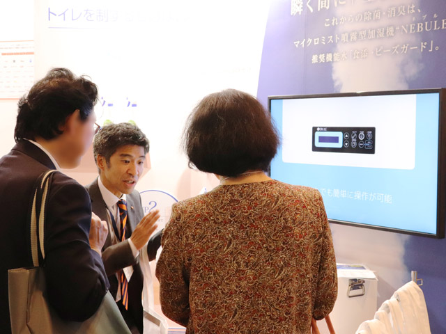 新型のステンレス製・スチール製の2機種を、食品添加物・殺菌料のピーズガードと合わせご紹介。ピーズガードについてはトイレをイメージした空間を壁面一面に作り出し、ノロウイルス抑制セットとしてオートディスペンサーやスプレータイプをご紹介いたしました。