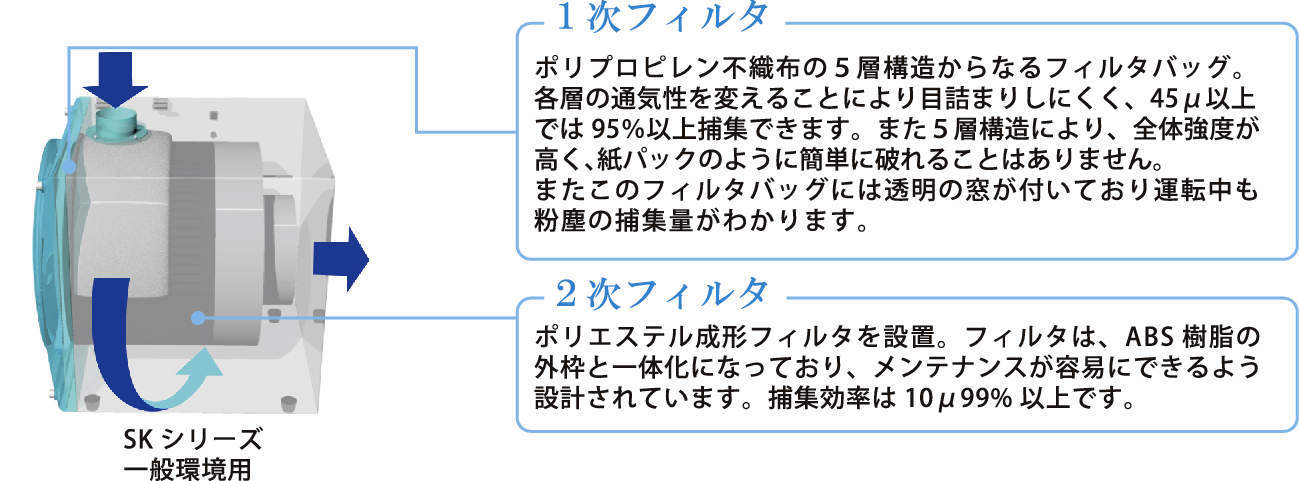 クリーンルーム内でも使用することができ、メンテナンスも簡単な小型高性能集塵機です。CHIKOの風量型集塵機:SKシリーズ