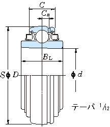 ・UK形軸受は給油機構を備え球状外径面の外輪とテーパ穴内輪を持つ、シールとスリンガが付くグリース密封形深溝玉軸受です。