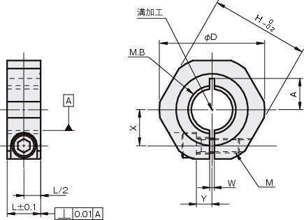 | SCS30N14CH | 鉄(SGD3)/黒染め | M30×P3.5 | 14 | 50 | 54 | 2 | 19.5 | 8.5 | 18 | M6×20 | 151 |