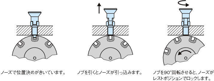 ・ノブを引くとノーズが引っ込み位置決め解除が簡単にでき、手を放すとノーズは内蔵スプリングによって元の状態に戻るハンド操作のスプリングプランジャーです。