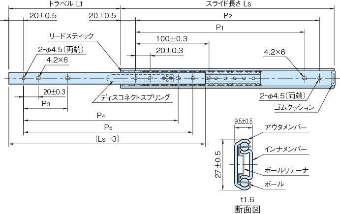 ・ロールフォーミング工法で成形されたインナーメンバーとアウターメンバーによる高精度で滑らかなボールベアリングスライドレールです。