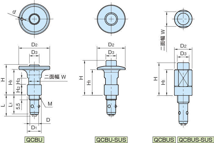 | ボタン | QCBU・QCBUS:S45C、無電解ニッケルメッキ、焼入焼戻 QCBU-SUS・QCBUS-SUS:SUS420J2、無電解ニッケルメッキ、焼入焼戻 |