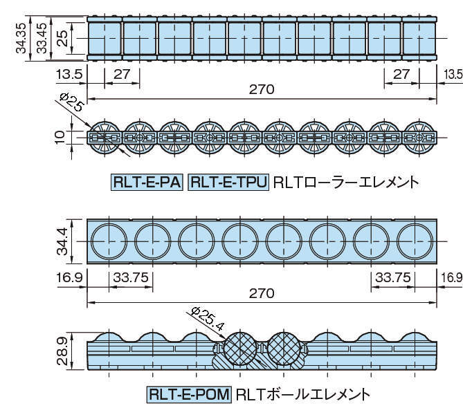 ・ RLT-E-PA:許容荷重が高く、ローラー1個あたりの 許容荷重は360Nです。