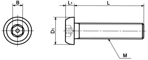 ・六角穴の中央にピンのついたボタンボルト。