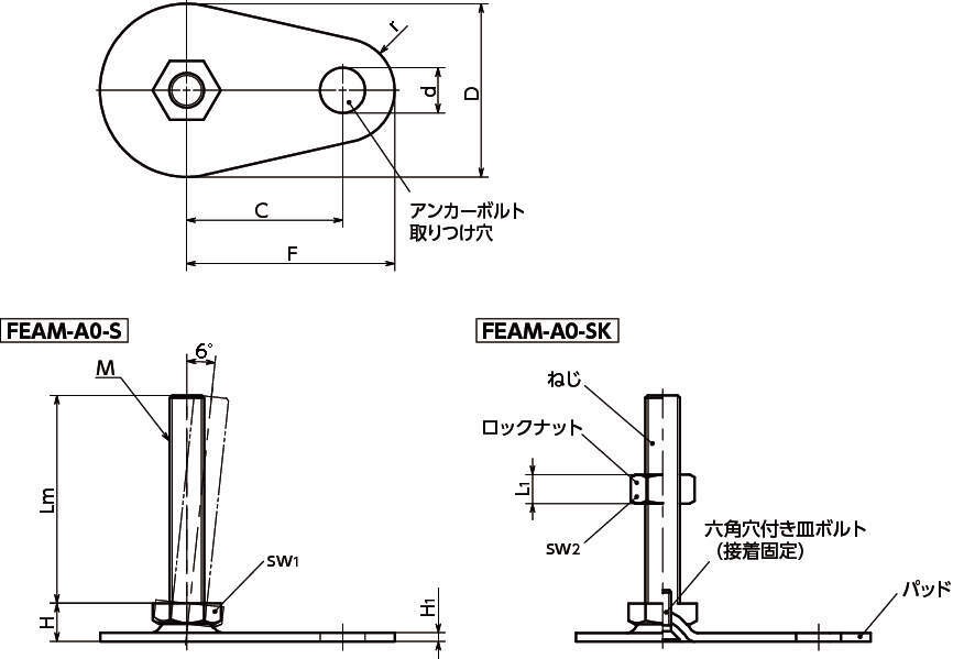 レベリングアジャスタ(おねじ) アンカー固定タイプ 六角調整 FEAM-A0-S