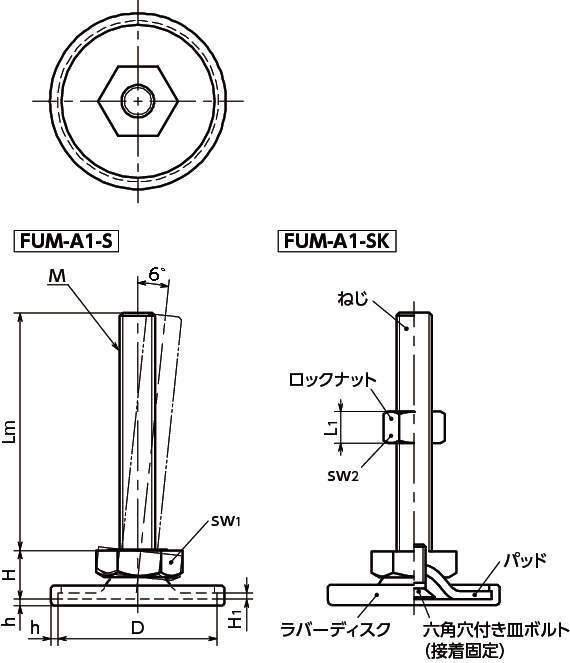 レベリングアジャスタ(おねじ) 六角調整 ラバーディスクつき FUM-A1-S