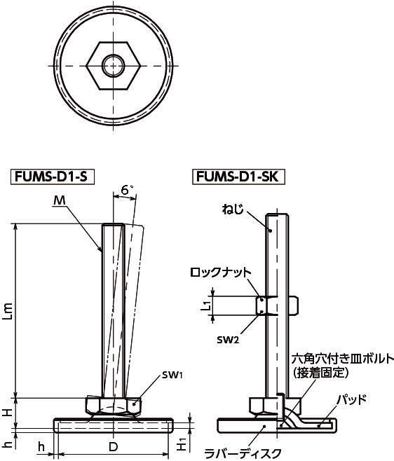 レベリングアジャスタ(おねじ) 六角調整 ラバーディスクつき FUMS-D1-S
