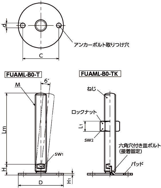 レベリングアジャスタ(おねじ) SUS316L アンカー固定タイプ 二面幅調整 FUAML-B0-T