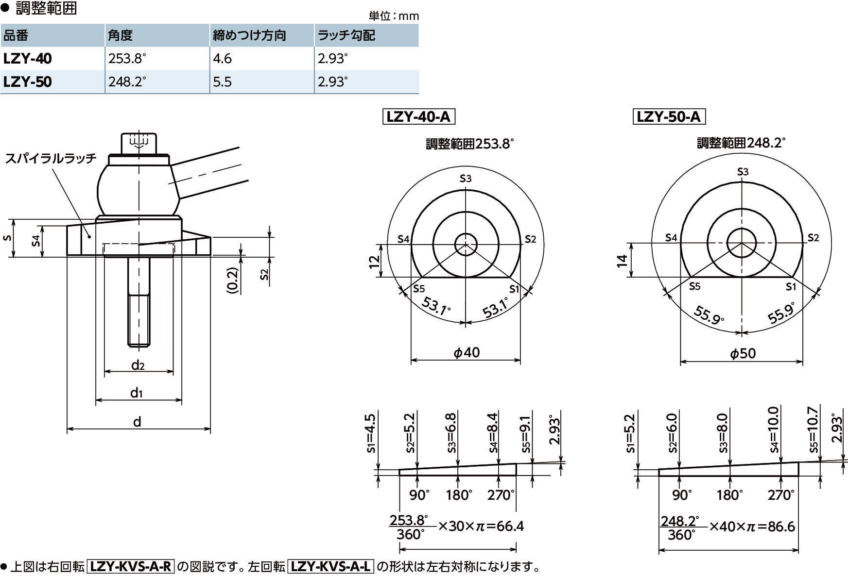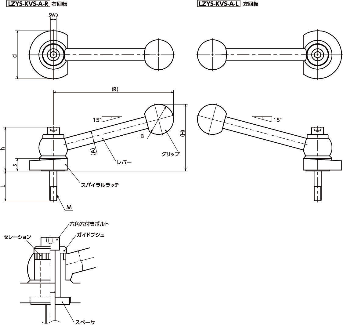 ・スパイラルラッチを利用した締結用のレバー。上方向への締めつけが無段階に調整できます。