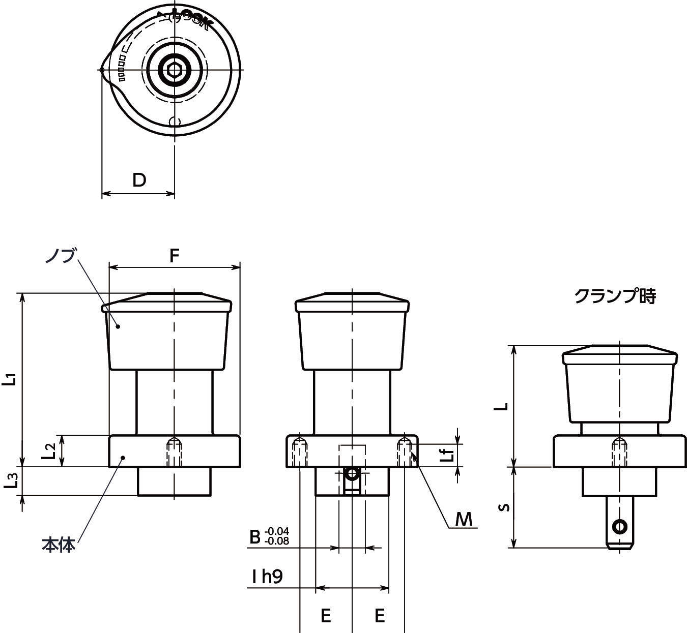 ・ノブの突起とレーザ刻印により、クランプ形状が一目で確認できます。