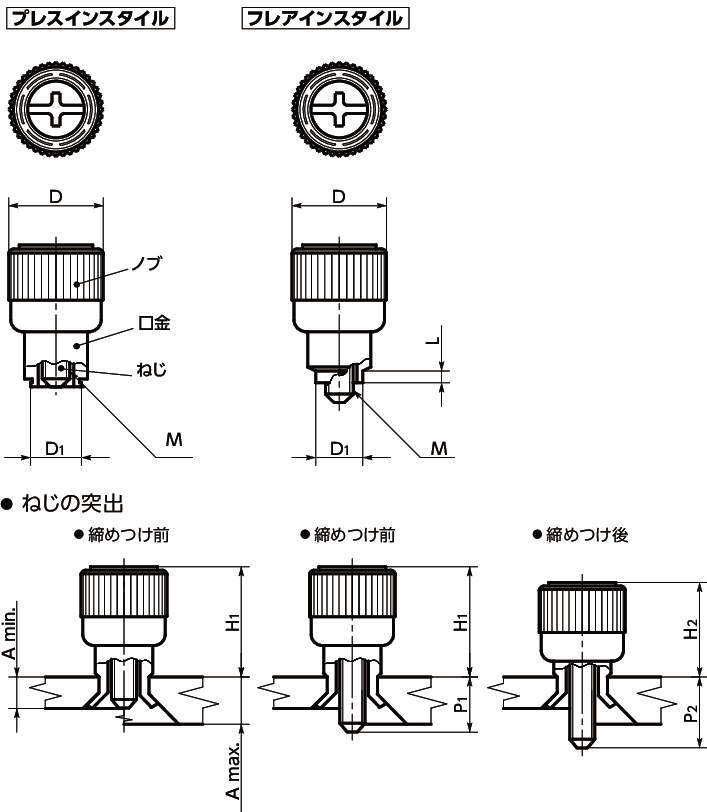 ・スプリングが内蔵されており、ねじをゆるめた状態ではノブが飛び出しています。このため、ねじの締め忘れを防止できます。