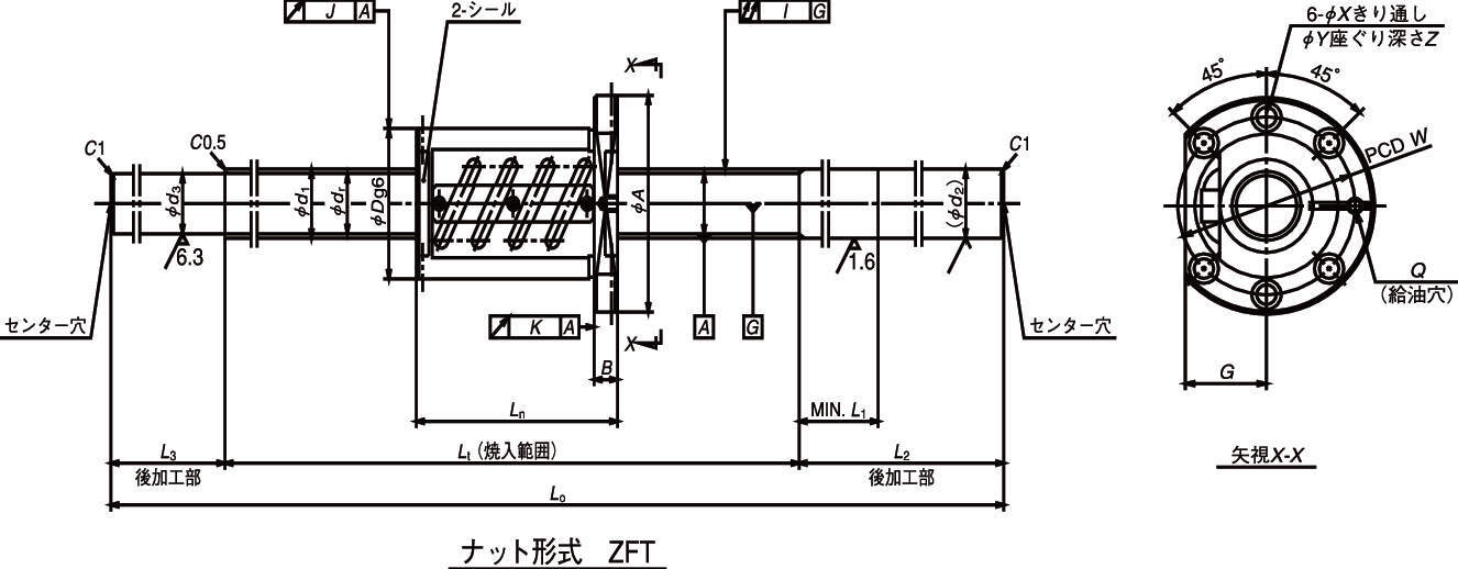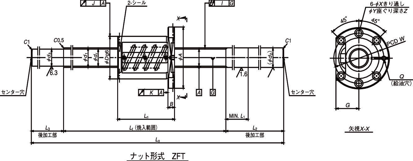 動定格Ca 静定格C0a 外径 D フランジ部 全長 Ln 取付穴 給油 Q ねじ部 Lt 右軸端 左軸端 全長 L0 目標値 T 誤差 ep 変動 Vv 軸心の振れI 円周振れ