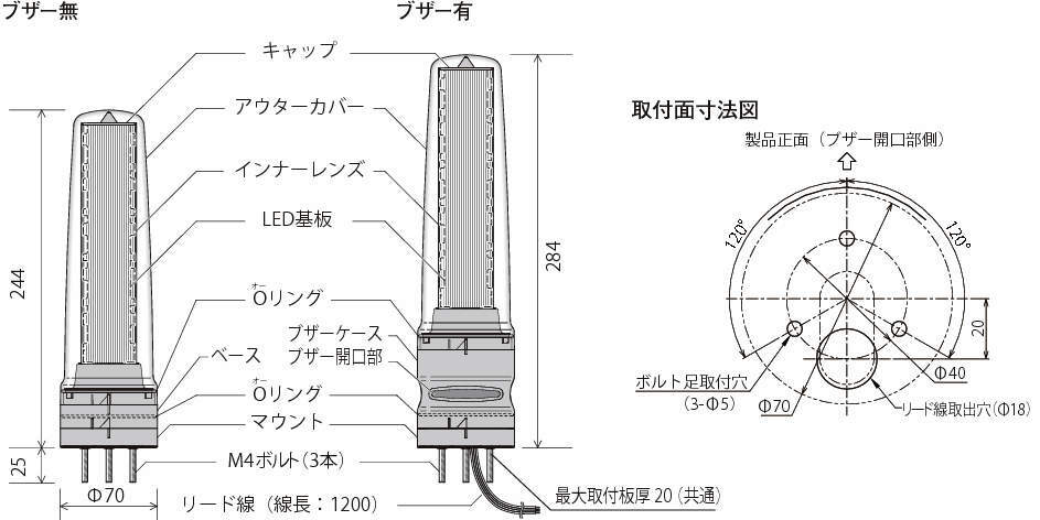 LS7-302SFBWH-RYGNN LS7 シルバー φ70 3 点灯・点滅 あり DC24V NPN/PNP リード線 赤・黄・緑 0.73kg