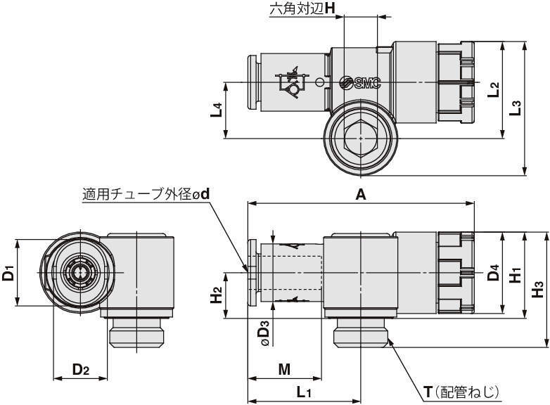 タイプ 外径 φd シール方式 ねじタイプ 接続口径 T 自由流れ 制御流れ 自由流れ 制御流れ Unlock lock D1 D2