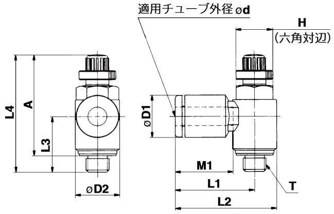 | タイプ | 外径 φd | シール方式 | ねじタイプ | 接続口径 T | 自由流れ | 制御流れ | 自由流れ | 制御流れ | 自由流れ | 制御流れ | MAX. | MIN. | MAX. | MIN. | ||||||||||||||||||