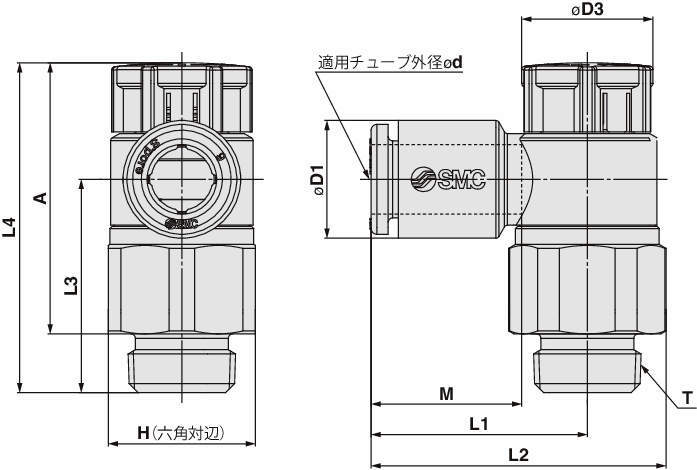 低速制御用 ワンタッチ管継手付スピードコントローラ(プッシュロック式) エルボタイプ AS-FM-A・AS-FC-A