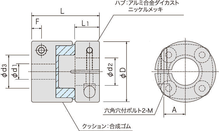 ・クッション式カップリングは、ハブの突起物の囲まれた円筒型のクッションが変形することで偏心・偏角や回転振動を吸収します。