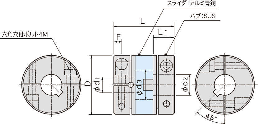 ・ステンレス製ハブとアルミ青銅製スライダの組み合わせ:オールメタルのオルダムカップリング。