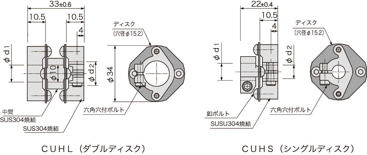 ・ハブ、中間の材質はSUS304焼結で常用トルク大。