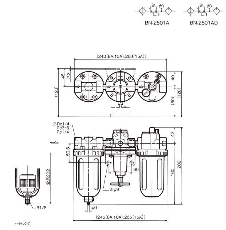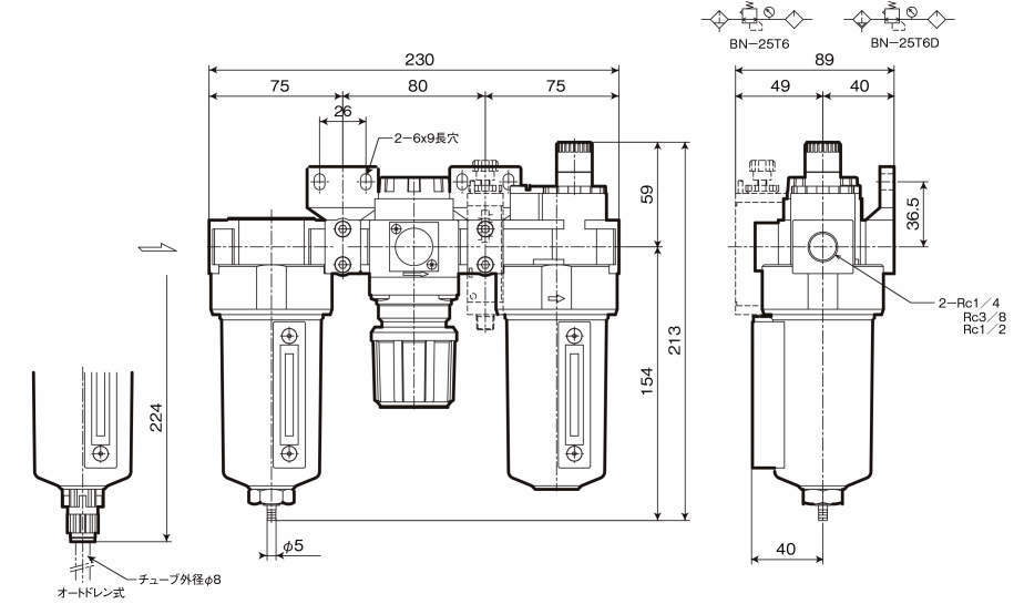 | BN-25T6D-8 | BN-25T6 | 8A | Rc1/4 | 0.05~1.0 | 0.05~0.85 | 200 | 80 | 5 | 空気 | 1.9 | オートドレン付 | - |