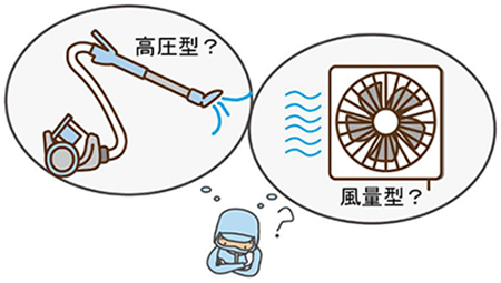 風量型集塵機は換気扇のように風の量で吸い込むタイプの集塵機で、高圧型集塵機は掃除機のように高い圧力で吸い上げるタイプの集塵機です。