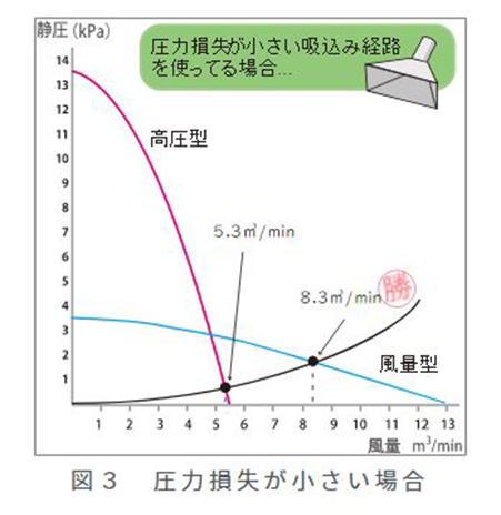 圧力損失が小さい場合について考えます。抵抗曲線が図のようになる場合、発生する風量は、高圧型集塵機(CBA-1200AT3-HI-V1)で5.3㎥/min、風量型集塵機(SK-750AT-PM)では8.3㎥/minになります。このように圧力損失が小さい条件下では、高圧型より風量型の方が、風量は大きくなります。高圧型集塵機の使い方