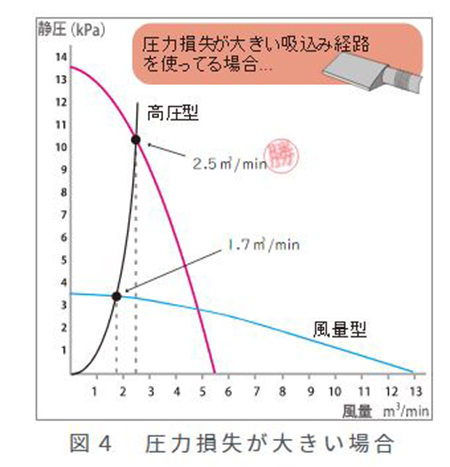 図1は性能曲線の例ですが、赤の曲線が高圧型集塵機の性能曲線、青の曲線が風量型集塵機の性能曲線を表しています。性能曲線を用いた風量の確認