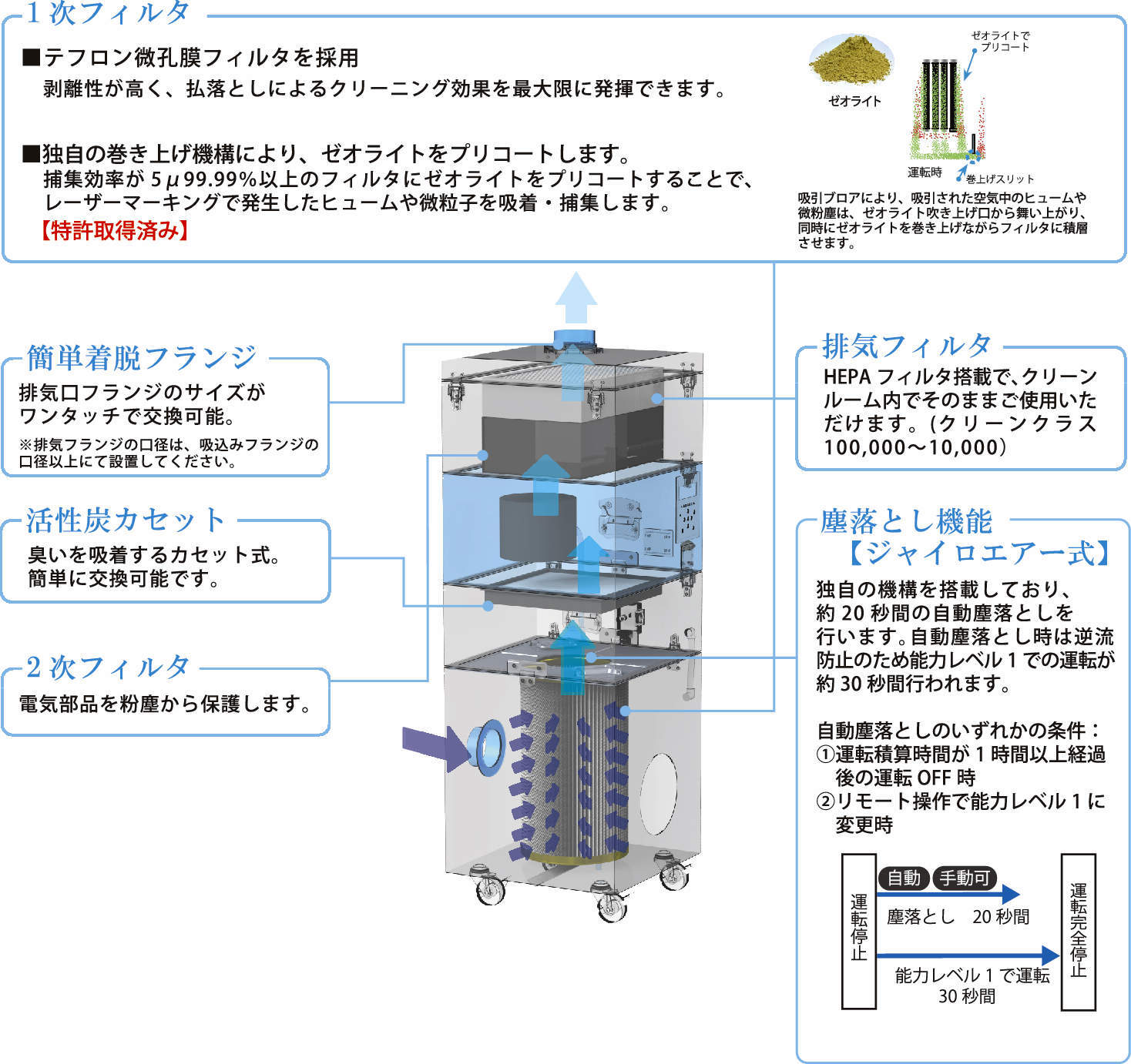 ・テフロン微孔膜フィルタ搭載により、粉塵の剥離性が高く、独自の巻き上げ機構により、ゼオライト(添加剤)を1次フィルタ表面にプリコートし、フィルタの長寿命化を実現しました。