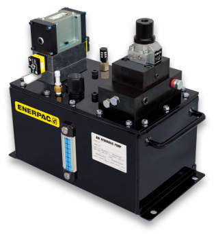 ・エアと油圧ピストンの高サイクルのレシプロ運動により油圧の連続吐出を行い、設定圧力に近づくとレシプロ運動は低サイクルになり、設定圧力に到達した時点でエアポンプの運動はエア圧力と油圧力がバランスして自動停止します。油圧力が低下すると自動的にエアポンプが作動し、回路の油圧力を自動補償します。