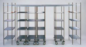 ・固定およびモービルユニットを構成する棚板は抗菌クリアコーティングとステンレスの2タイプ。ポールはSUS304ステンレス製です。スーパー・タイプのどの機種にも対応します。