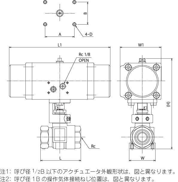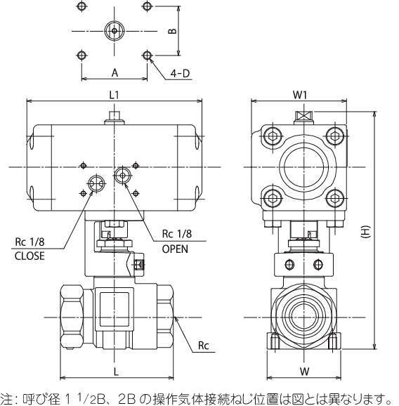 | アクチュエータ部 | 操作圧力:0.39~0.69MPa 周囲温度:−10~60℃(但し、凍結なきこと。) 操作気体接続ネジ(開閉共):Rc1/8 開閉速度:1秒以下 備考:操作流体がドライエアー及び窒素ガスの場合、オイラーを使用して下さい。 |